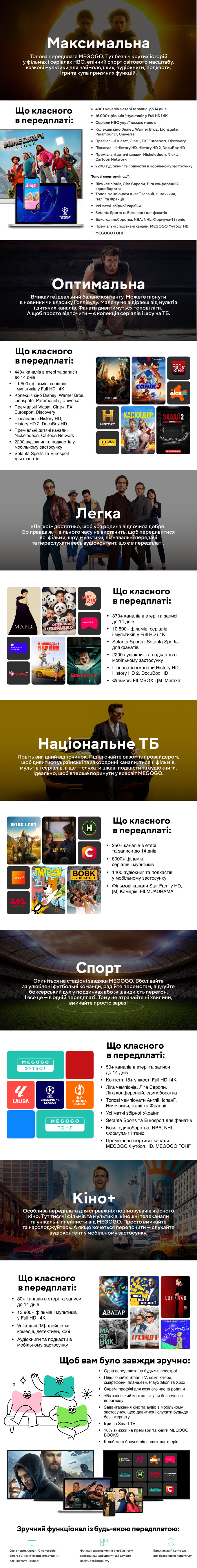 Тарифи MEGOGO - Кіно і ТБ*** - Кількість каналів актуальна станом на 15.08.2025 і може змінюватися. Актуальний перелік каналів дивіться за посиланням: https://megogo.net/ua/tv Передплата – сервіс, який передбачає автоматичне продовження послуги та списання коштів з вашого балансу в розмірі вартості замовленої вами послуги. |